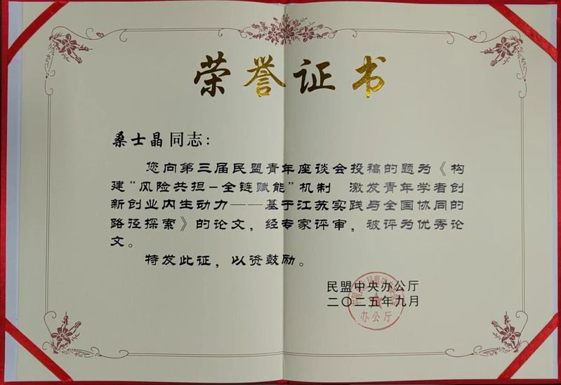 9月9日至10日,第三届民盟青年座谈会在上海举办。会议共收到论文242篇,评选出优秀论文56篇。其中,民盟徐州工程学院委员会盟员桑士晶提交的论文《构建“风险共担–全链赋能”机制 激发青年学者创新创业内生动力——基于江苏实践与全国协同的路径探索》被评为优秀论文。