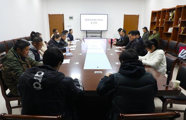 培训交流环节在我校体育学院会议室举行。体育学院党总支副书记陈益群致欢迎词。江南大学人文学院舞蹈编导教研室主任刘悦钧、黎伟平副处长和丰县民族中学教练朱金秀,分别就《民族传统体育表演项目的编排与组训》《江苏省民族传统体育发展状况及对徐州推动民族传统体育建设的意见建议》《如何在学校开展民族传统体育项目》做了专题讲解和交流。