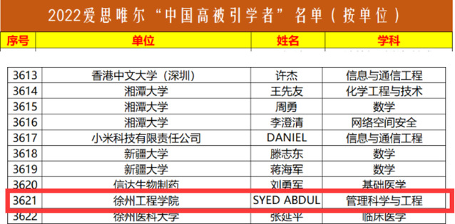 近日,爱思唯尔(Elsevier)正式发布了2022年“中国高被引学者”(Highly Cited Chinese Researchers)榜单。我校管理工程学院SYED ABDUL教授荣登管理科学与工程学科高被引榜单。