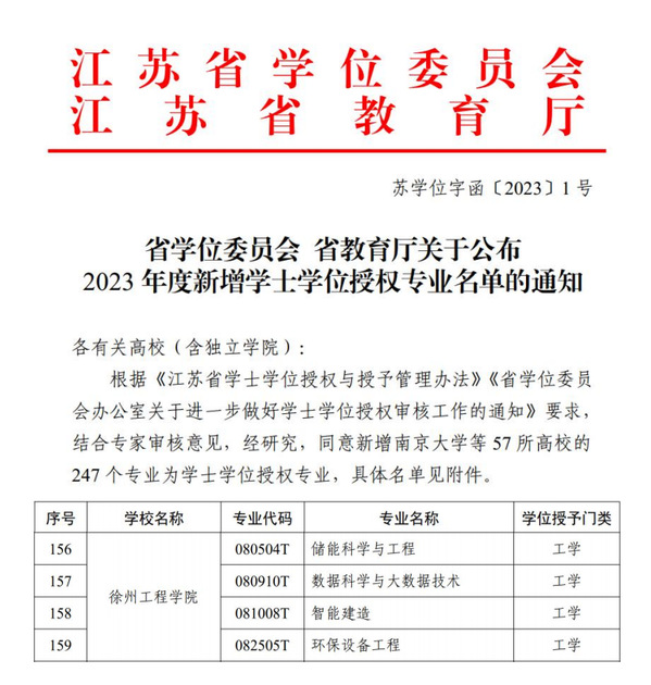 日前,江苏省学位委员会、江苏省教育厅发布《省学位委员会省教育厅关于公布2023年度新增学士学位授权专业名单的通知》(苏学位字函〔2023〕1号),我校“储能科学与工程” “数据科学与大数据技术” “智能建造” “环保设备工程”等四个专业顺利通过新增学士学位授权专业增列审核,获得学士学位授予权。