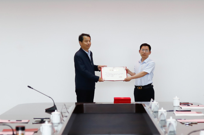 张宁为捐资人江苏高治建设工程有限公司董事长王成华颁发了荣誉证书。