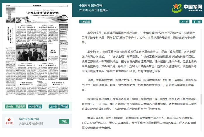新闻链接:http://www.81.cn/szb_223187/szblb/index.html?paperName=jfjb&paperDate=2023-05-20&paperNumber=06