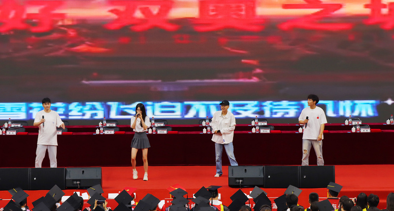 典礼开始前,播放了记载2023届毕业生校园生活精彩瞬间的视频短片,学生代表倾情演唱了欢快的歌曲《一起向未来》,将在场师生们的记忆带回四年的美好时光中,重温那些并肩同行、奋力拼搏的幸福时刻。
