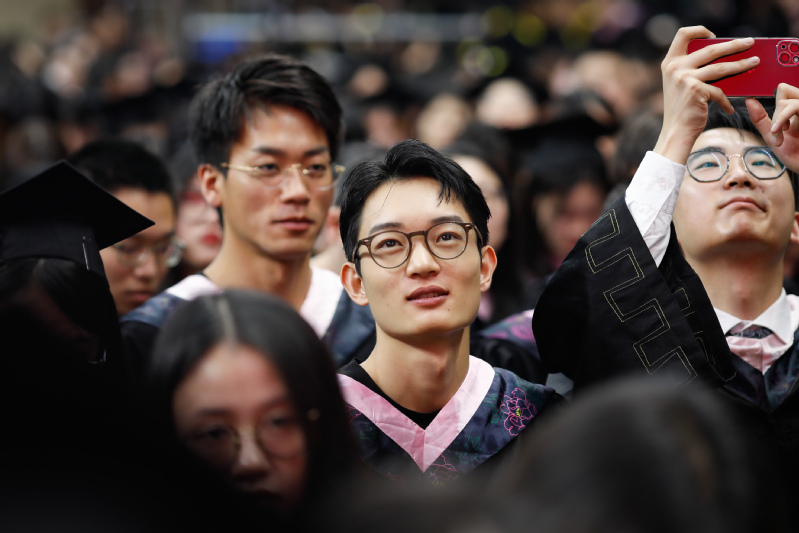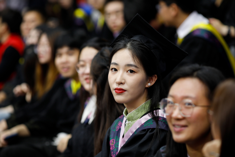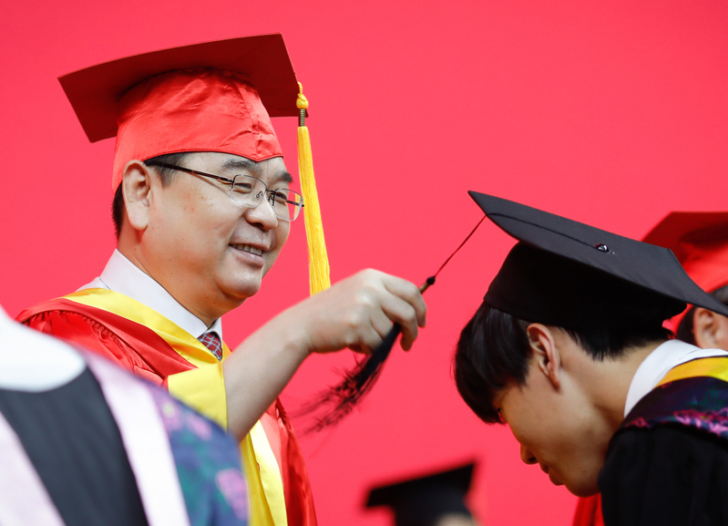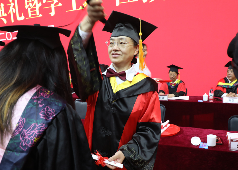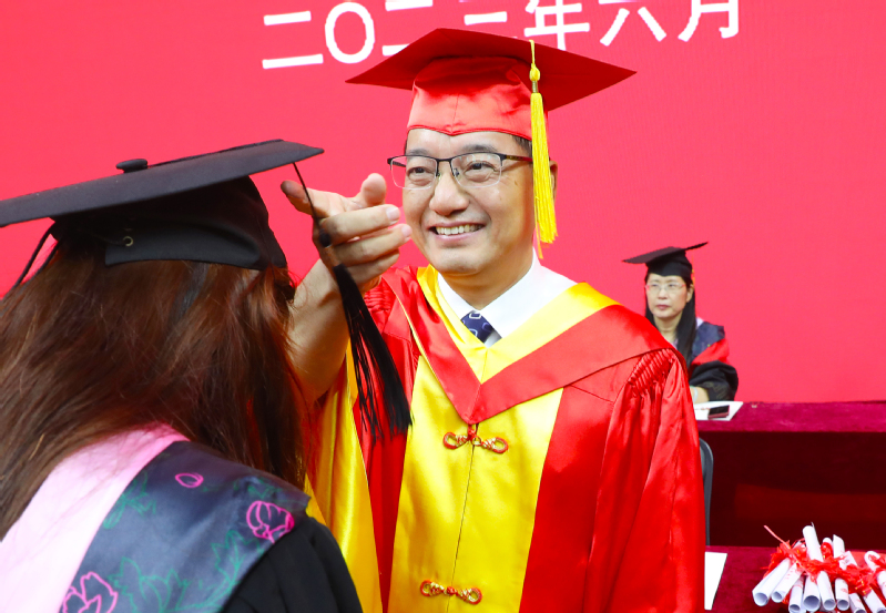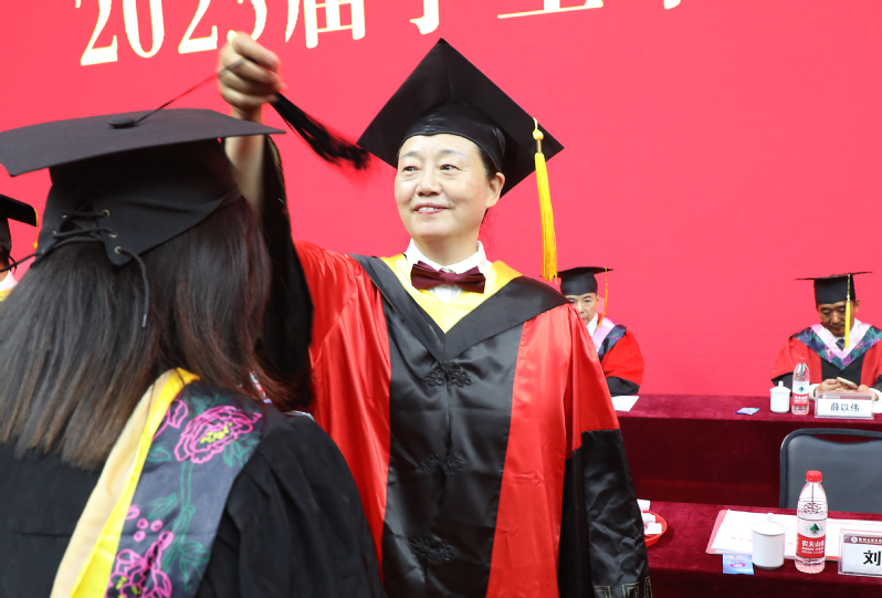 在欢快的乐曲与热烈的掌声中,全体校领导、校党委常委为2023届毕业生代表颁发学位证书并行拨穗礼。