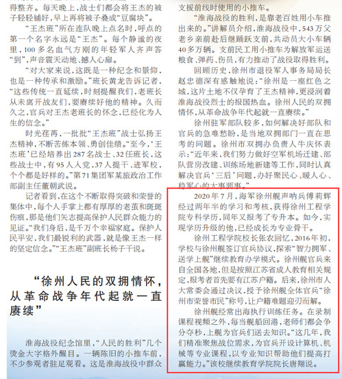 6月25日,《人民日报》第06版报道了徐州市传承王杰精神的有关情况,其中对我校智力拥军及徐州舰官兵学历提升项目作了介绍。