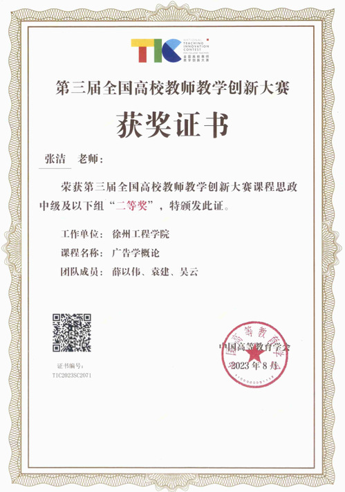 8月20-22日,第三届全国高校教师教学创新大赛在浙江大学举行,我校人文学院张洁老师领衔的《广告学概论》课程团队(张洁、薛以伟、袁建、吴云)荣获课程思政中级及以下组二等奖。