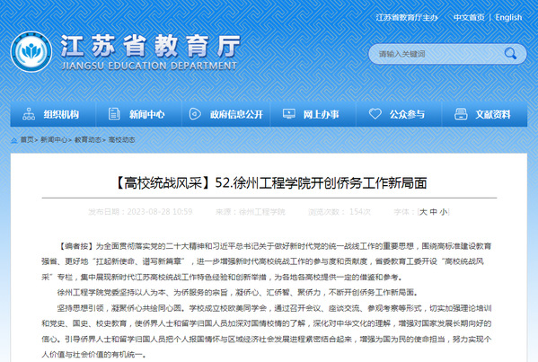近日,省教育厅官网以“徐州工程学院开创侨务工作新局面”为题,报道我校统战侨务特色工作。