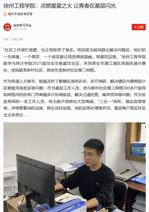 10月10日,学习强国平台以“徐州工程学院:点燃星星之火 让青春在基层闪光”为题,报道我校数统学院扎实推进毕业生服务基层工作。