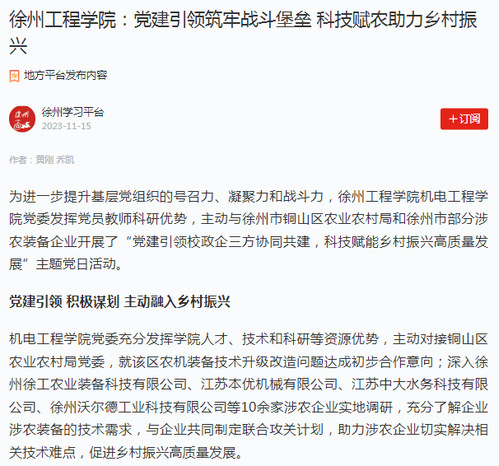 11月15日,学习强国平台以“徐州工程学院:党建引领筑牢战斗堡垒 科技赋农助力乡村振兴”为题报道我校机电工程学院基层党建特色工作。