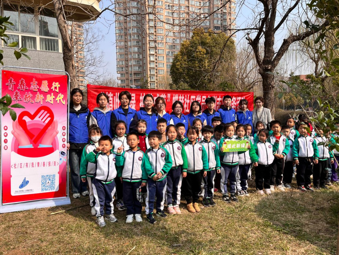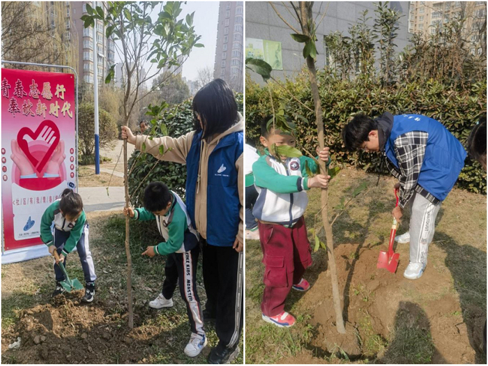 在新城区蝶梦社区,我校信息工程学院的学生志愿者们联合新城幼师幼儿园小朋友们手持铁锹、水桶,共同投入到植树活动中。他们手把手地教小朋友们如何挖坑、培土、浇水,让小朋友们在亲身体验中感受到植树的乐趣和意义,同时在实践中学习环保知识,培养爱护环境的意识。经过一番努力,一颗颗小树苗在空地上挺立起来,象征着生命与希望。2023级数据科学与大数据技术专业的高璐同学表示,“我们将继续宣传绿水青山就是金山银山的环保理念,做生态文明建设的实践者推动者,为文明创建贡献青春力量,让祖国天更蓝、山更绿、水更清、生态环境更美好。”