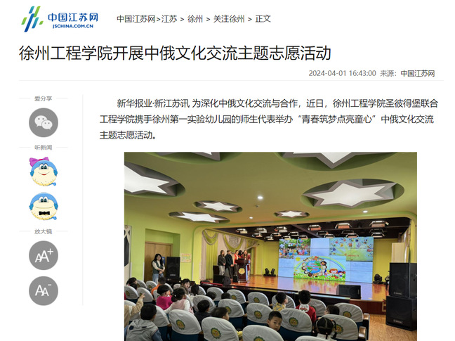 近日,中国江苏网报道我校圣彼得堡联合工程学院携手徐州第一实验幼儿园的师生代表举办“青春筑梦点亮童心”中俄文化交流主题志愿活动。