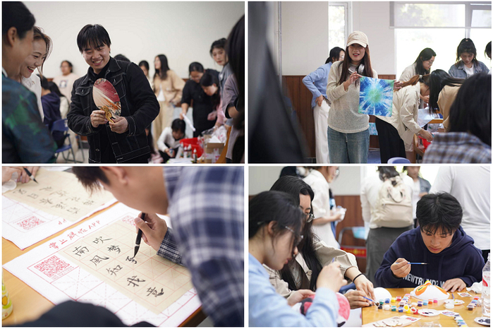 此次活动以非遗制作为载体,包含漆扇制作、书法创作、剪纸体验、脸谱彩绘、手工扎染等非遗体验项目。同学们在动手参与各项非遗活动的过程中,不仅感受到中国非物质文化遗产的魅力,更在亲自动手参与中释放内心情感,在创作过程中深入认识自己,学会调适情绪,为自己减压赋能。