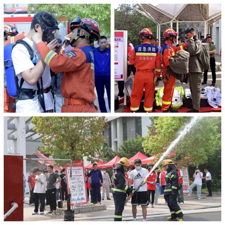 11日下午,徐州市度假区消防救援队应邀来校为学生宣讲日常急救常识、灭火避险知识,展示移动式水泵车及各类灭火器械的用途,指导学生体验多种防火防护服的穿戴,并通过“防灾安全知识大闯关”现场答题的形式为学生普及基本的防灾减灾常识。云龙区猎鹰救援队、江苏银行徐州分行、徐钢集团、学而思、薛定鳄等多家活动支持单位在宣传现场布展,校地协作共同为防灾减灾宣传发力。校党委常委、副校长王逢博,校保卫处、土木工程学院负责人出席活动现场。