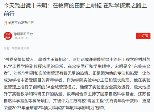 5月11日,学习强国“今天我出镜”栏目报道我校材料与化学工程学院宋明老师的工作事迹。