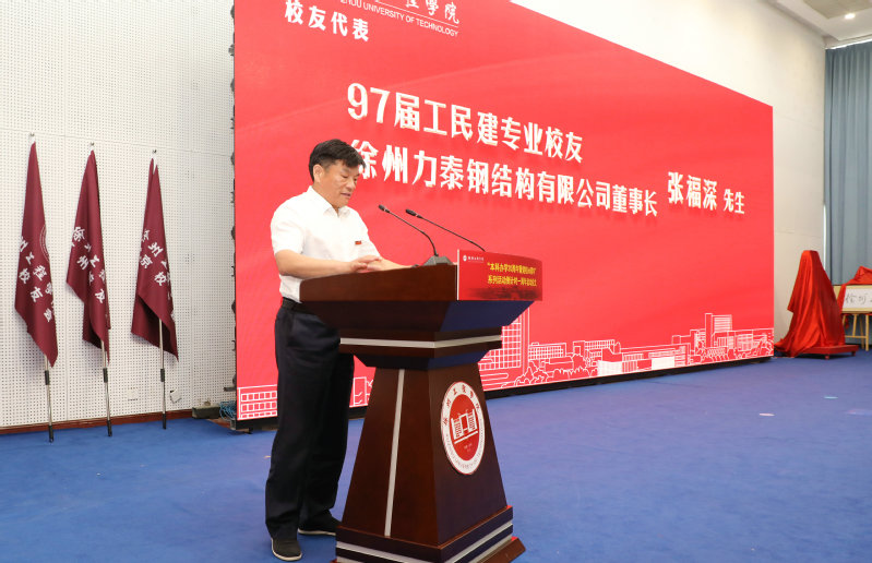 徐州力泰钢结构有限公司董事长张福深作为校友代表发言,他深情回顾了与母校的深情厚谊,对母校的培育之恩表示感谢,为母校的发展感到骄傲和自豪,表示将同全体校友一道为母校的未来献计献策,为母校的发展添砖加瓦!