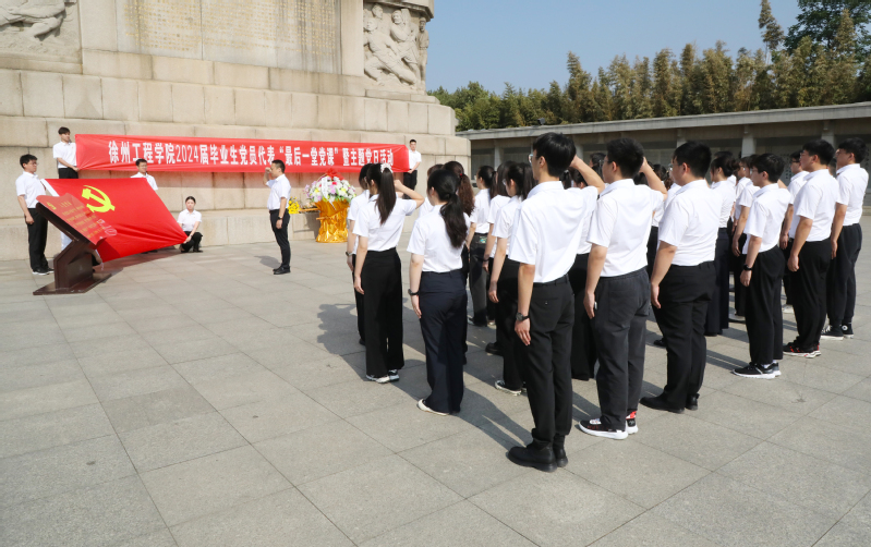 在淮海战役烈士纪念塔前,毕业生党员代表列队整齐,静静肃立。毕业生党员代表向革命烈士敬献花篮,大家重温入党誓词。随后,全体人员参观党纪学习教育专题展览,进一步强化纪律意识,不断增强政治定力、纪律定力、道德定力、抵腐定力。