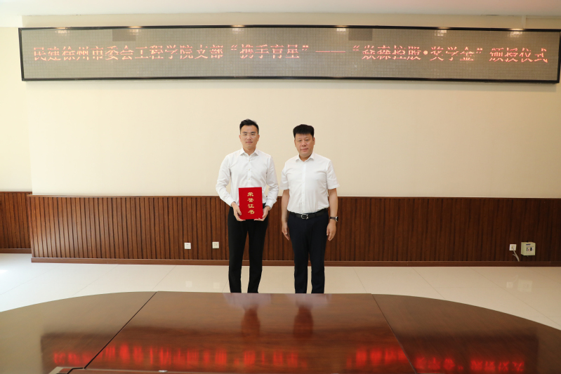 仪式上,民建企业界会员焱森控股(江苏)有限公司董事长李海涛捐赠“携手育星”奖(助)学金,王逢博为李海涛颁发捐赠证书。