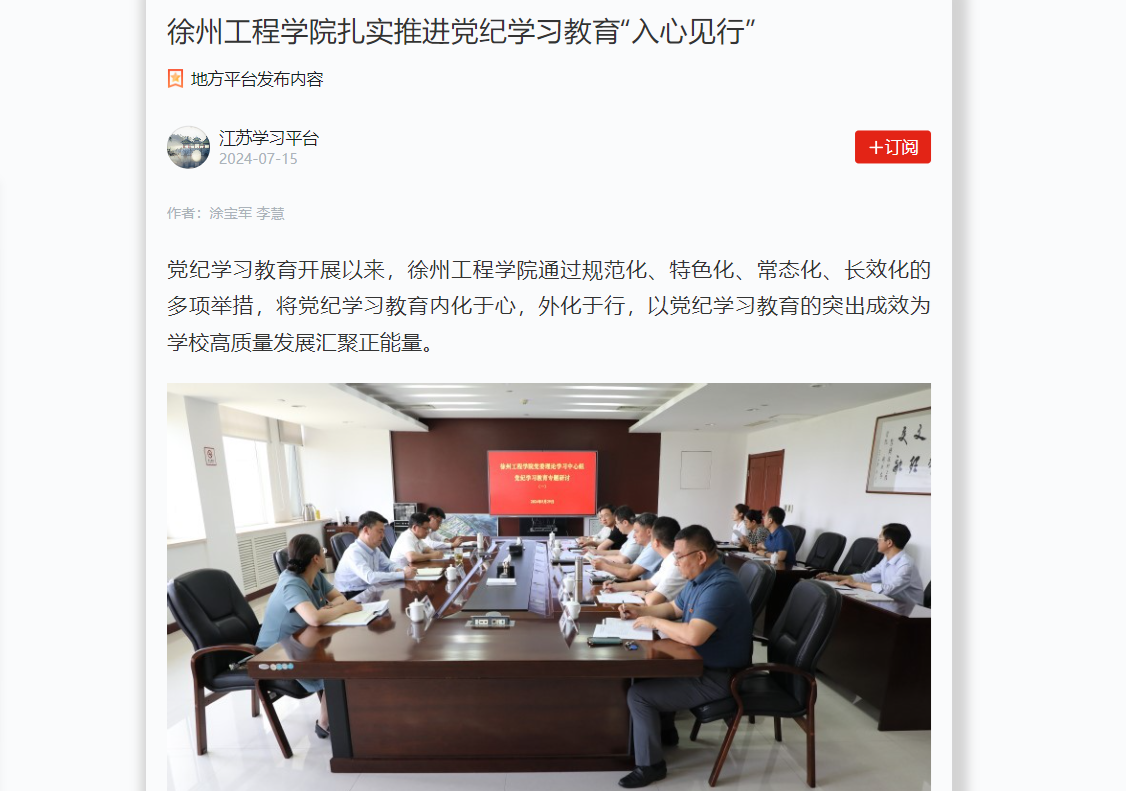 文章指出,党纪学习教育开展以来,徐州工程学院通过规范化、特色化、常态化、长效化的多项举措,将党纪学习教育内化于心,外化于行,以党纪学习教育的突出成效为学校高质量发展汇聚正能量。