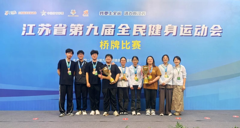 江苏省第九届全民健身运动会桥牌比赛于8月17日至20日在苏州举行,由我校学生组成的徐州市代表队经过顽强拼搏,获得青年女子团体冠军和青年男子团体季军。为徐州市和我校争得了荣誉。