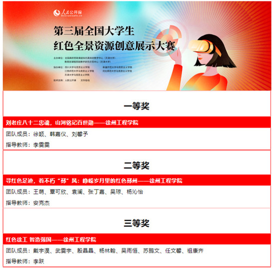 近日,第三届全国大学生红色全景资源创意展示大赛结果揭晓。我校马克思主义学院李雯雯、安克杰和李跃老师指导的作品:《刘老庄八十二忠魂,山河铭记百世勋》《寻红色足迹,着不朽“邳”风:峥嵘岁月里的红色邳州》《红色徐工 智造强国》分别斩获一、二、三等奖,在该项赛事中取得历史性突破。这也是学校“数字+思政”创新思路的典型应用案例。